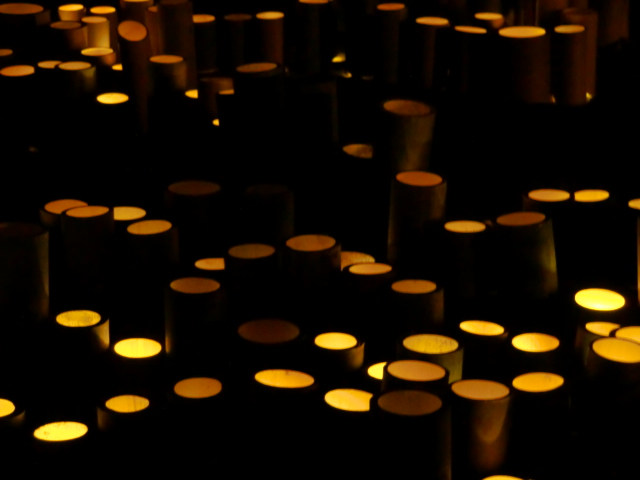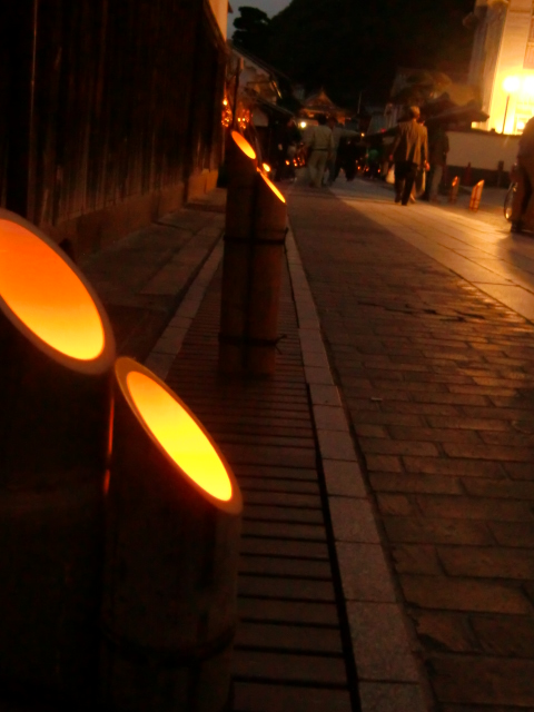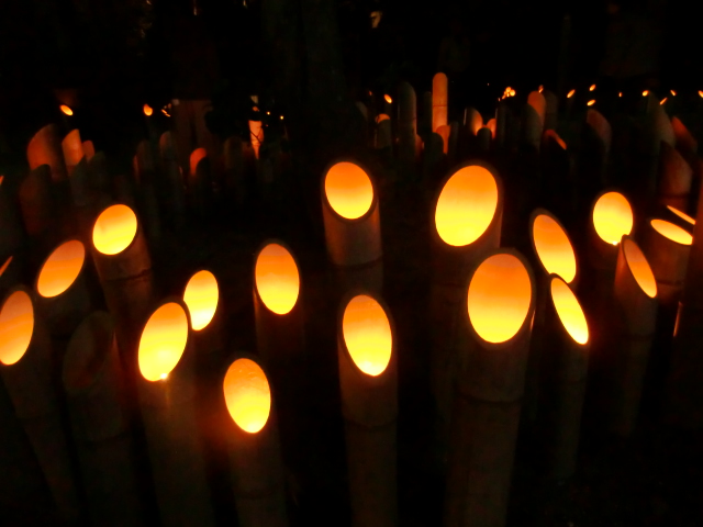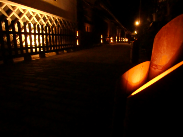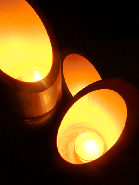 こんな感じで竹を切って、その中に小さい蝋燭を入れて明かりにしてます。